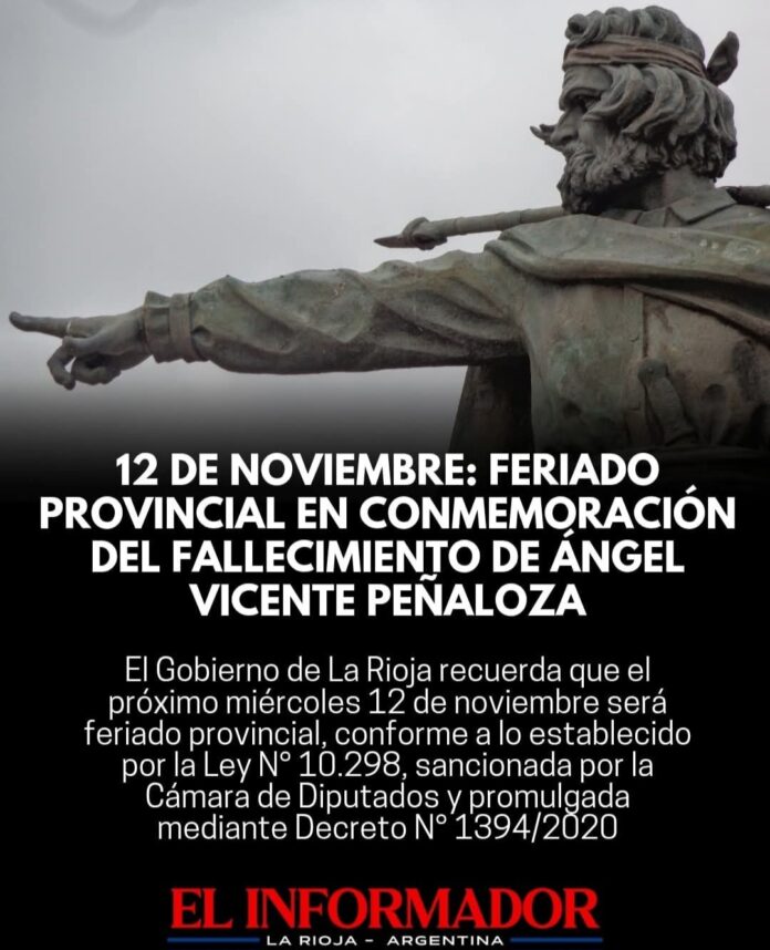 Inicio Local 12 de noviembre: Feriado provincial en conmemoración del fallecimiento de Ángel Vicente...Local12 de noviembre: Feriado provincial en conmemoración del fallecimiento de Ángel Vicente Peñaloza noviembre 11, 2025FacebookTwitterPinterestVKWhatsApp Artículos relacionadosMás del autorEncontraron a un hombre de 86 años que llevaba meses muerto en su domicilio en Barrio FerroviarioLa Rioja homenajeó a los veteranos de Malvinas con el tradicional desfile del 2 de abrilEl COE inicia el operativo de Semana Santa en el Señor de la PeñaDEJA UNA RESPUESTA Cancelar respuestaPor favor ingrese su comentario! Por favor ingrese su nombre aquí ¡Has introducido una dirección de correo electrónico incorrecta!Por favor ingrese su dirección de correo electrónico aquí Guardar mi nombre, correo electrónico y sitio web en este navegador la próxima vez que comente.