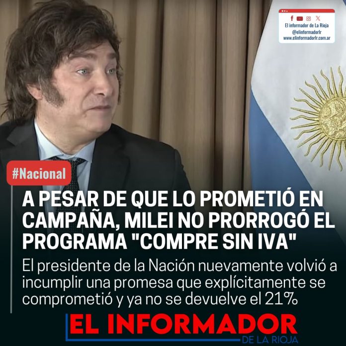 Inicio Destacadas A PESAR DE QUE LO PROMETIÓ EN CAMPAÑA, MILEI NO PRORROGÓ EL...DestacadasA PESAR DE QUE LO PROMETIÓ EN CAMPAÑA, MILEI NO PRORROGÓ EL PROGRAMA «COMPRE SIN IVA» enero 2, 2024FacebookTwitterPinterestVKWhatsApp Artículos relacionadosMás del autorCristina Kirchner declara en Comodoro PY por la causa cuadernosIrán advirtió que Milei «cruzó una linea roja» con sus declaraciones sobre el conflictoAdvierten que la industria Argentina retrocedió a niveles de 2003DEJA UNA RESPUESTA Cancelar respuestaPor favor ingrese su comentario! Por favor ingrese su nombre aquí ¡Has introducido una dirección de correo electrónico incorrecta!Por favor ingrese su dirección de correo electrónico aquí Guardar mi nombre, correo electrónico y sitio web en este navegador la próxima vez que comente.