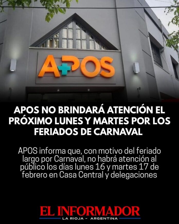 Inicio Local Apos no brindará atención el próximo lunes y martes por los feriados...LocalApos no brindará atención el próximo lunes y martes por los feriados de carnaval febrero 13, 2026FacebookTwitterPinterestVKWhatsApp Artículos relacionadosMás del autorLa Rioja homenajeó a los veteranos de Malvinas con el tradicional desfile del 2 de abrilEl COE inicia el operativo de Semana Santa en el Señor de la PeñaLa policía despliega un amplio operativo de seguridad por Semana SantaDEJA UNA RESPUESTA Cancelar respuestaPor favor ingrese su comentario! Por favor ingrese su nombre aquí ¡Has introducido una dirección de correo electrónico incorrecta!Por favor ingrese su dirección de correo electrónico aquí Guardar mi nombre, correo electrónico y sitio web en este navegador la próxima vez que comente.