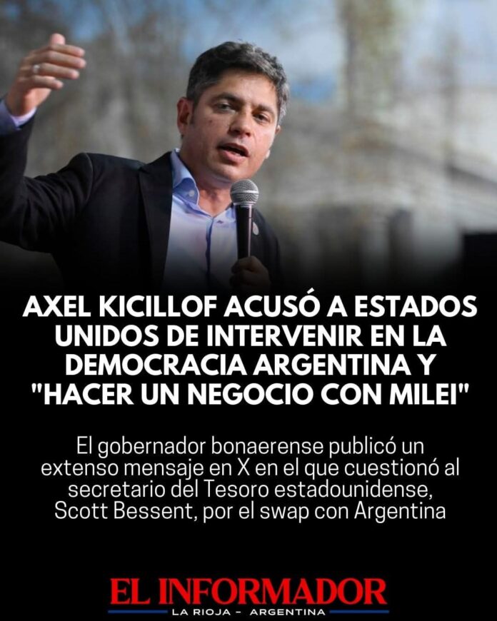 Inicio Destacadas Axel Kicillof acusó a Estados Unidos de intervenir en la democracia Argentina...DestacadasAxel Kicillof acusó a Estados Unidos de intervenir en la democracia Argentina y «hacer un negocio con Milei» noviembre 13, 2025FacebookTwitterPinterestVKWhatsApp Artículos relacionadosMás del autorYPF estabiliza el precio de la nafta por 45 días: No trasladará la suba del petróleoLa pobreza cayó en el segundo semestre y cerró el 2025 en 28,2%Franco Colapinto traerá la Formula 1 a las calles de Buenos Aires con un Road Show en PalermoDEJA UNA RESPUESTA Cancelar respuestaPor favor ingrese su comentario! Por favor ingrese su nombre aquí ¡Has introducido una dirección de correo electrónico incorrecta!Por favor ingrese su dirección de correo electrónico aquí Guardar mi nombre, correo electrónico y sitio web en este navegador la próxima vez que comente.