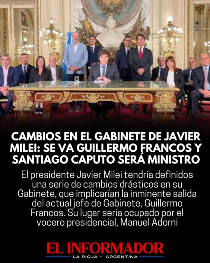 Inicio Destacadas Cambios en el gabinete de Javier Milei: Se va Guillermo Francos y...DestacadasCambios en el gabinete de Javier Milei: Se va Guillermo Francos y Santiago Caputo será Ministro noviembre 1, 2025FacebookTwitterPinterestVKWhatsApp Artículos relacionadosMás del autorLa carne subió un 10% en marzo y recarga el IPC, como en febreroSegún la escribana, Adorni compró el departamento de Caballito en 12 cuotas y sin interesesJavier Milei volvió a atacar a los periodistas y aseguró que «la motosierra sigue encendida»DEJA UNA RESPUESTA Cancelar respuestaPor favor ingrese su comentario! Por favor ingrese su nombre aquí ¡Has introducido una dirección de correo electrónico incorrecta!Por favor ingrese su dirección de correo electrónico aquí Guardar mi nombre, correo electrónico y sitio web en este navegador la próxima vez que comente.