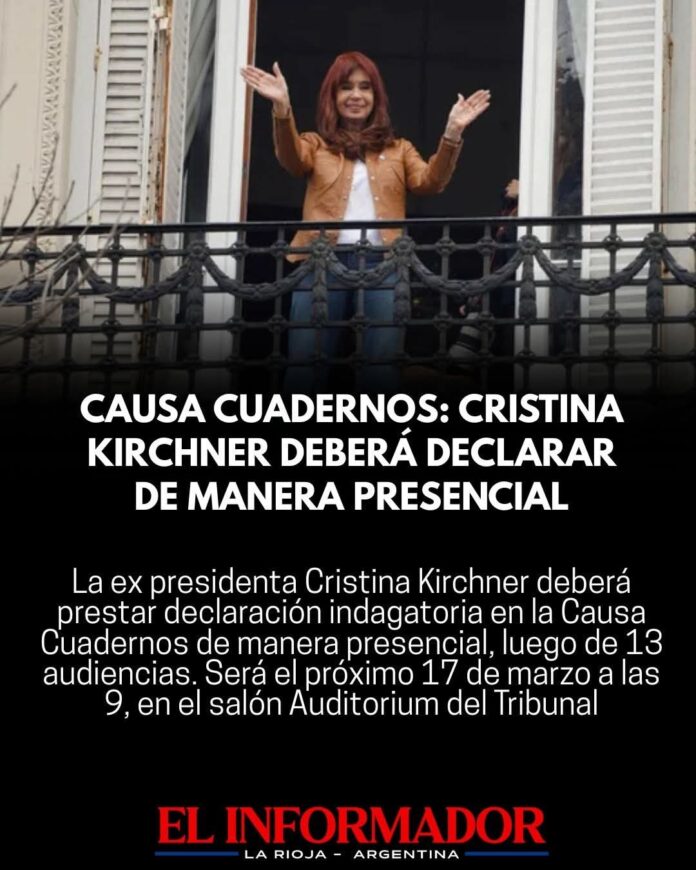Inicio Destacadas Causa Cuadernos: Cristina Kirchner deberá declarar de manera presencialDestacadasJudicialesCausa Cuadernos: Cristina Kirchner deberá declarar de manera presencial marzo 11, 2026FacebookTwitterPinterestVKWhatsApp Artículos relacionadosMás del autorLa Perla: Identificaron en Córdoba los restos de 12 víctimas de la última dictadura militarLa industria del neumático registra una caída histórica de su actividad productiva»Trump abrió la puerta a una negociación con Irán: «Depende en que términos, pero es posible»DEJA UNA RESPUESTA Cancelar respuestaPor favor ingrese su comentario! Por favor ingrese su nombre aquí ¡Has introducido una dirección de correo electrónico incorrecta!Por favor ingrese su dirección de correo electrónico aquí Guardar mi nombre, correo electrónico y sitio web en este navegador la próxima vez que comente.