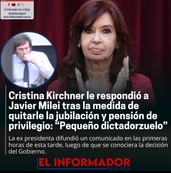 Inicio Destacadas Cristina Kirchner le respondió a Javier Milei tras la medida de quitarle...DestacadasCristina Kirchner le respondió a Javier Milei tras la medida de quitarle la jubilación y pensión de privilegio: «pequeño dictadorzuelo» noviembre 14, 2024FacebookTwitterPinterestVKWhatsApp Artículos relacionadosMás del autorYPF estabiliza el precio de la nafta por 45 días: No trasladará la suba del petróleoLa pobreza cayó en el segundo semestre y cerró el 2025 en 28,2%Franco Colapinto traerá la Formula 1 a las calles de Buenos Aires con un Road Show en PalermoDEJA UNA RESPUESTA Cancelar respuestaPor favor ingrese su comentario! Por favor ingrese su nombre aquí ¡Has introducido una dirección de correo electrónico incorrecta!Por favor ingrese su dirección de correo electrónico aquí Guardar mi nombre, correo electrónico y sitio web en este navegador la próxima vez que comente.