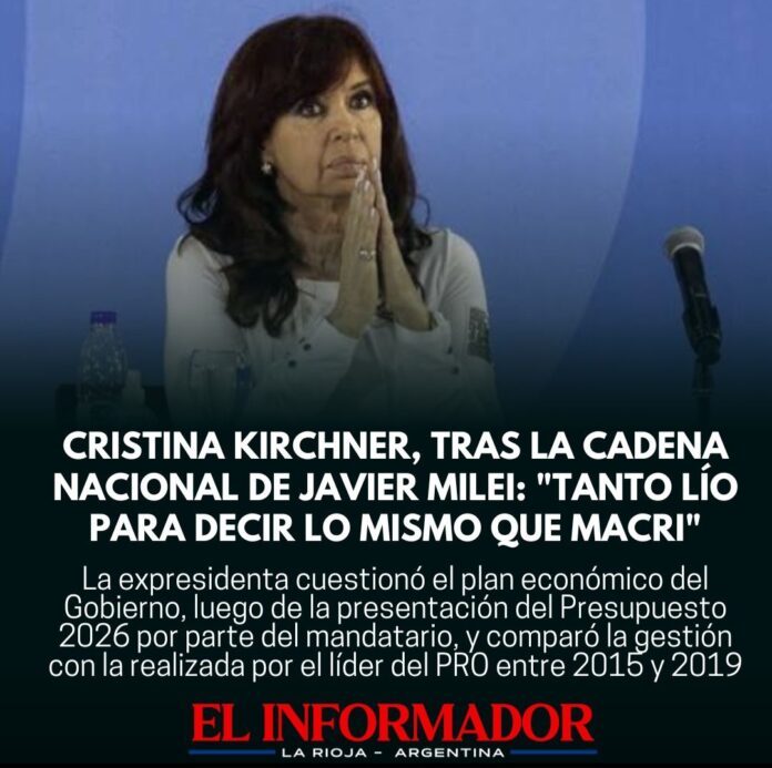 Inicio Política Cristina Kirchner, tras la cadena nacional de Javier Milei: «tanto lío para...PolíticaCristina Kirchner, tras la cadena nacional de Javier Milei: «tanto lío para decir lo mismo que Macri» septiembre 17, 2025FacebookTwitterPinterestVKWhatsApp Artículos relacionadosMás del autorSegún la escribana, Adorni compró el departamento de Caballito en 12 cuotas y sin interesesJavier Milei volvió a atacar a los periodistas y aseguró que «la motosierra sigue encendida»Ley de Glaciares: La Libertad Avanza y aliados convirtieron en Ley la reforma de forma contundenteDEJA UNA RESPUESTA Cancelar respuestaPor favor ingrese su comentario! Por favor ingrese su nombre aquí ¡Has introducido una dirección de correo electrónico incorrecta!Por favor ingrese su dirección de correo electrónico aquí Guardar mi nombre, correo electrónico y sitio web en este navegador la próxima vez que comente.