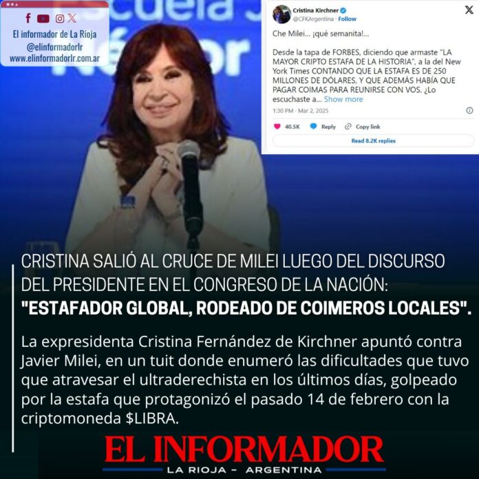 Inicio Destacadas Cristina salió al cruce de Milei luego del discurso del Presidente en...DestacadasCristina salió al cruce de Milei luego del discurso del Presidente en el Congreso de la Nación: «ESTAFADOR GLOBAL, RODEADO DE COMERCIOS LOCALES» marzo 4, 2025FacebookTwitterPinterestVKWhatsApp Artículos relacionadosMás del autorDetuvieron al hijastro del hombre de 88 años que fue encontrado sin vida en su casaYPF estabiliza el precio de la nafta por 45 días: No trasladará la suba del petróleoLa pobreza cayó en el segundo semestre y cerró el 2025 en 28,2%DEJA UNA RESPUESTA Cancelar respuestaPor favor ingrese su comentario! Por favor ingrese su nombre aquí ¡Has introducido una dirección de correo electrónico incorrecta!Por favor ingrese su dirección de correo electrónico aquí Guardar mi nombre, correo electrónico y sitio web en este navegador la próxima vez que comente.