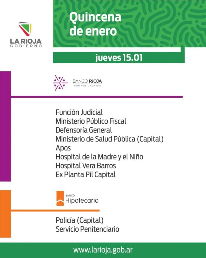 LocalActualizado: enero 14, 2026Cronograma de pago: Quincena eneroenero 14, 2026CuotaFacebookTwitterPinterestVKWhatsApp Mas NoticiasLocalSaul Narvaez - marzo 3, 2026Cronograma de pago: Haberes FebreroNacionalSaul Narvaez - marzo 3, 2026El Senador Pagotto y su hijo asesor con sueldo de 3, 5 millones en el SenadoNacionalSaul Narvaez - marzo 3, 2026Gabriela Pedrali: «Desde que asumió Milei, más de 4.000 riojanos perdieron su trabajo»CuotaFacebookTwitterPinterestVKWhatsApp Artículo anteriorConvocatoria abierta para solicitar cobertura de docente de apoyo a la inclusiónArtículo siguienteTere Madera volvió a Chepes, asistió con equipamiento al municipio y visitó a vecinos afectados por el temporal- Advertisement - DEJA UNA RESPUESTA Cancelar respuestaComentario:Por favor ingrese su comentario! Nombre:*Por favor ingrese su nombre aquí Correo electrónico:*¡Has introducido una dirección de correo electrónico incorrecta!Por favor ingrese su dirección de correo electrónico aquí Sitio web: Guardar mi nombre, correo electrónico y sitio web en este navegador la próxima vez que comente. Ultimas noticiasLocalSaul Narvaez - marzo 3, 2026Cronograma de pago: Haberes Febrero NacionalEl Senador Pagotto y su hijo asesor con sueldo de 3, 5 millones en el Senado Saul Narvaez - marzo 3, 2026 NacionalGabriela Pedrali: «Desde que asumió Milei, más de 4.000 riojanos perdieron su trabajo» Saul Narvaez - marzo 3, 2026 LocalLa Rioja fortalece su agenda minera internacional en la PDAC 2026 Saul Narvaez - marzo 3, 2026 LocalLa Cruz de los Mártires ya puede visitarse en la Legislatura Saul Narvaez - marzo 2, 2026 Esto tambien te puede interesarCronograma de pago: Haberes Febrero Local Saul Narvaez - marzo 3, 2026 La Rioja fortalece su agenda minera internacional en la PDAC 2026 Local Saul Narvaez - marzo 3, 2026 La Cruz de los Mártires ya puede visitarse en la Legislatura Local Saul Narvaez - marzo 2, 2026 El Festival de la Chaya ya tiene su documental Local Saul Narvaez - febrero 28, 2026 - Advertisement -