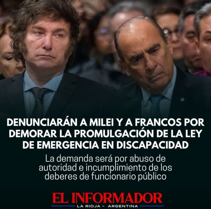 Inicio Destacadas Denunciarán a Milei y a Francos por demorar la promulgación de la...DestacadasDenunciarán a Milei y a Francos por demorar la promulgación de la Ley de Emergencia en Discapacidad septiembre 18, 2025FacebookTwitterPinterestVKWhatsApp Artículos relacionadosMás del autorLa carne subió un 10% en marzo y recarga el IPC, como en febreroSegún la escribana, Adorni compró el departamento de Caballito en 12 cuotas y sin interesesJavier Milei volvió a atacar a los periodistas y aseguró que «la motosierra sigue encendida»DEJA UNA RESPUESTA Cancelar respuestaPor favor ingrese su comentario! Por favor ingrese su nombre aquí ¡Has introducido una dirección de correo electrónico incorrecta!Por favor ingrese su dirección de correo electrónico aquí Guardar mi nombre, correo electrónico y sitio web en este navegador la próxima vez que comente.
