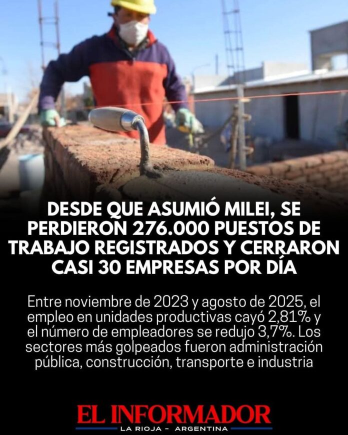 Inicio Destacadas Desde que asumió Milei se perdieron 276.000 puestos de trabajo registrados y...DestacadasDesde que asumió Milei se perdieron 276.000 puestos de trabajo registrados y cerraron casi 30 empresas por día noviembre 17, 2025FacebookTwitterPinterestVKWhatsApp Artículos relacionadosMás del autorLa actividad económica no repunta: En febrero cayó un 2,6% mensual y tuvo su peor caída desde diciembre de 2023¿Vivir para pagar? La deuda no bancaria ya asfixia a 6 de cada 10 hogaresAlberto Fernández, a un paso del juicio oral por violencia de género contra Fabiola YañezDEJA UNA RESPUESTA Cancelar respuestaPor favor ingrese su comentario! Por favor ingrese su nombre aquí ¡Has introducido una dirección de correo electrónico incorrecta!Por favor ingrese su dirección de correo electrónico aquí Guardar mi nombre, correo electrónico y sitio web en este navegador la próxima vez que comente.