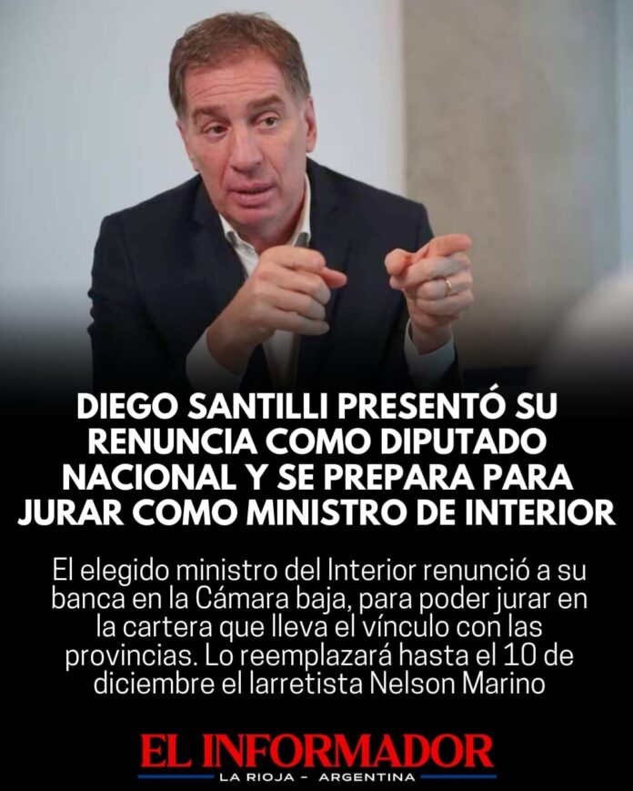 Inicio Destacadas Diego Santilli presentó su renuncia como Diputado Nacional y se prepara para...DestacadasDiego Santilli presentó su renuncia como Diputado Nacional y se prepara para jurar como Ministro del Interior noviembre 10, 2025FacebookTwitterPinterestVKWhatsApp Artículos relacionadosMás del autorDetuvieron al hijastro del hombre de 88 años que fue encontrado sin vida en su casaYPF estabiliza el precio de la nafta por 45 días: No trasladará la suba del petróleoLa pobreza cayó en el segundo semestre y cerró el 2025 en 28,2%DEJA UNA RESPUESTA Cancelar respuestaPor favor ingrese su comentario! Por favor ingrese su nombre aquí ¡Has introducido una dirección de correo electrónico incorrecta!Por favor ingrese su dirección de correo electrónico aquí Guardar mi nombre, correo electrónico y sitio web en este navegador la próxima vez que comente.