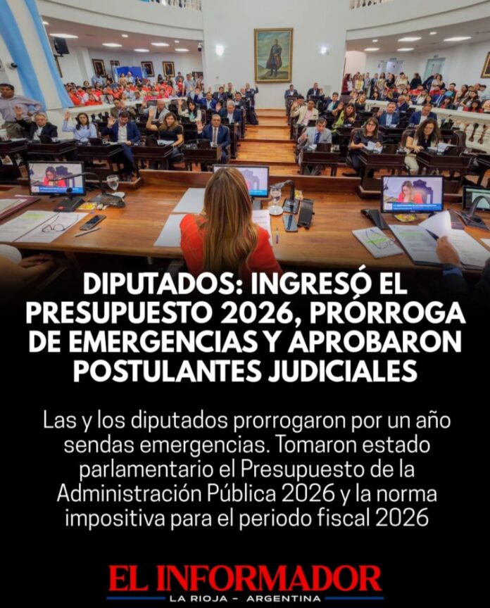 Inicio Local Diputados: Entró el presupuesto 2026, prórroga de emegencias y aprobaron postulantes judicialesLocalDiputados: Entró el presupuesto 2026, prórroga de emegencias y aprobaron postulantes judiciales noviembre 7, 2025FacebookTwitterPinterestVKWhatsApp Artículos relacionadosMás del autorEncontraron a un hombre de 86 años que llevaba meses muerto en su domicilio en Barrio FerroviarioLa Rioja homenajeó a los veteranos de Malvinas con el tradicional desfile del 2 de abrilEl COE inicia el operativo de Semana Santa en el Señor de la PeñaDEJA UNA RESPUESTA Cancelar respuestaPor favor ingrese su comentario! Por favor ingrese su nombre aquí ¡Has introducido una dirección de correo electrónico incorrecta!Por favor ingrese su dirección de correo electrónico aquí Guardar mi nombre, correo electrónico y sitio web en este navegador la próxima vez que comente.