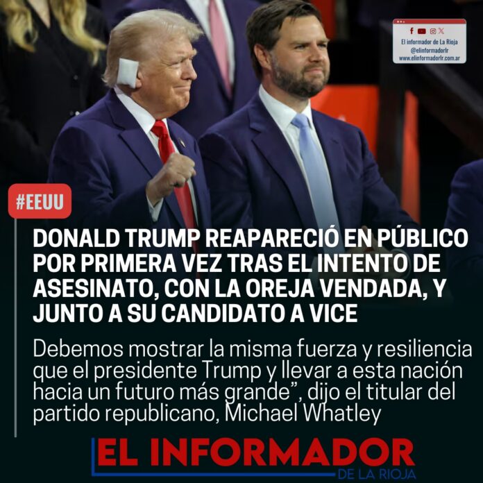 Inicio Internacionales DONALD TRUMP REAPARECIÓ EN PÚBLICO POR PRIMERA VEZ TRAS EL INTENTO DE...InternacionalesDONALD TRUMP REAPARECIÓ EN PÚBLICO POR PRIMERA VEZ TRAS EL INTENTO DE ASESINATO, CON LA OREJA VENDADA, Y JUNTO A SU CANDIDTO A VICE julio 16, 2024FacebookTwitterPinterestVKWhatsApp Artículos relacionadosMás del autorIsrael elimina durante un ataque a un alto mando de Hezbolá en BeirutIrán vuelve a cerrar el Estrecho de Ormuz en represalia por los ataques de Israel en Líbano y tensiona el cese al fuegoTrump anunció un alto al fuego por dos semanas con Irán y puso como condición abrir el Estrecho de OrmuzDEJA UNA RESPUESTA Cancelar respuestaPor favor ingrese su comentario! Por favor ingrese su nombre aquí ¡Has introducido una dirección de correo electrónico incorrecta!Por favor ingrese su dirección de correo electrónico aquí Guardar mi nombre, correo electrónico y sitio web en este navegador la próxima vez que comente.