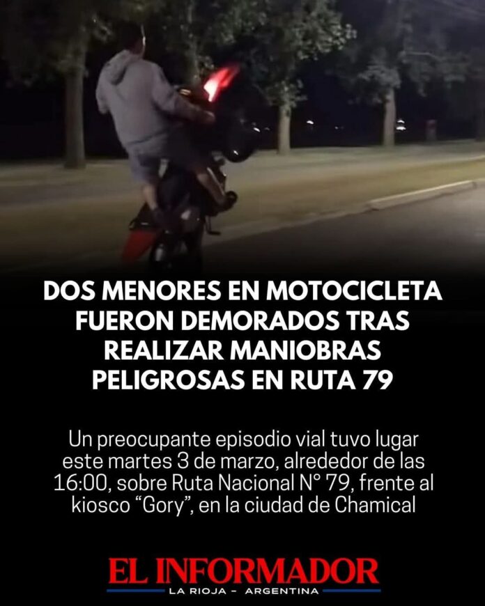 Inicio Local Dos menores en motocicleta fueron demorados tras realizar maniobras peligrosas en ruta...LocalDos menores en motocicleta fueron demorados tras realizar maniobras peligrosas en ruta 79 marzo 4, 2026FacebookTwitterPinterestVKWhatsApp Artículos relacionadosMás del autorAvanza una obra clave para mejorar la presión de agua en un sector de TalamuyunaChamical fue sede del inicio del ciclo lectivo 2026 con un fuerte de respaldo a la educación públicaLa Rioja presentó su potencial minero ante empresas e inversores en el Argentina Day-PDAC 2026DEJA UNA RESPUESTA Cancelar respuestaPor favor ingrese su comentario! Por favor ingrese su nombre aquí ¡Has introducido una dirección de correo electrónico incorrecta!Por favor ingrese su dirección de correo electrónico aquí Guardar mi nombre, correo electrónico y sitio web en este navegador la próxima vez que comente.