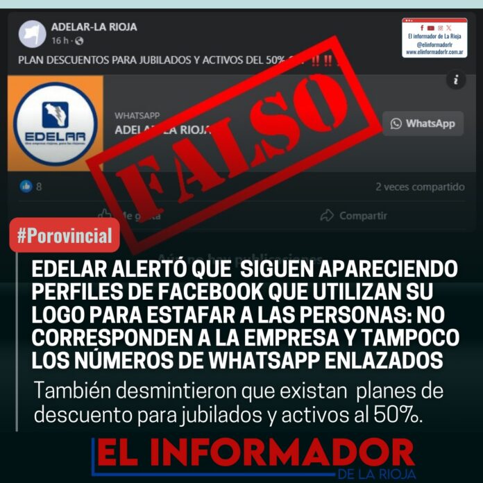Inicio Destacadas EDELAR ALERTÓ QUE SIGUEN APARECIENDO PERFILES DE FACEBOOK QUE UTILIZAN SU LOGO...DestacadasEDELAR ALERTÓ QUE SIGUEN APARECIENDO PERFILES DE FACEBOOK QUE UTILIZAN SU LOGO PARA ESTAFAR A LAS PERSONAS: NO CORRESPONDEN A LA EMPRESA Y TAMPOCO LOS NÚMEROS DE WHATSAPP ENLAZADOS julio 1, 2024FacebookTwitterPinterestVKWhatsApp Artículos relacionadosMás del autorCaso Ángel: Detuvieron a la mamá y al padrastroEncuesta: Consultora posiciona a Axel Kicillof como líder y principal referente opositorFamilias endeudadas: La morosidad volvió a crecer en febrero y se profundizó más en billeteras virtualesDEJA UNA RESPUESTA Cancelar respuestaPor favor ingrese su comentario! Por favor ingrese su nombre aquí ¡Has introducido una dirección de correo electrónico incorrecta!Por favor ingrese su dirección de correo electrónico aquí Guardar mi nombre, correo electrónico y sitio web en este navegador la próxima vez que comente.