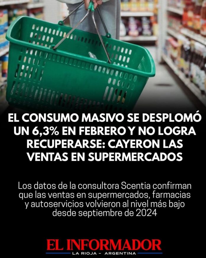 Inicio Destacadas El consumo masivo se desplomó un 6,3% en febrero y no logra...DestacadasEconomíaEl consumo masivo se desplomó un 6,3% en febrero y no logra recuperarse: Cayeron las ventas en supermercados marzo 26, 2026FacebookTwitterPinterestVKWhatsApp Artículos relacionadosMás del autorLa imágen más triste: Una jubilada comiendo de la basuraSergio Uñac quiere rearmar el peronismo de cara al 2027: «Es tiempo de tomar decisiones»Milei defendió a Manuel Adorni tras su conferencia de prensa: «Ignorantes alimentados por turbias operetas»DEJA UNA RESPUESTA Cancelar respuestaPor favor ingrese su comentario! Por favor ingrese su nombre aquí ¡Has introducido una dirección de correo electrónico incorrecta!Por favor ingrese su dirección de correo electrónico aquí Guardar mi nombre, correo electrónico y sitio web en este navegador la próxima vez que comente.