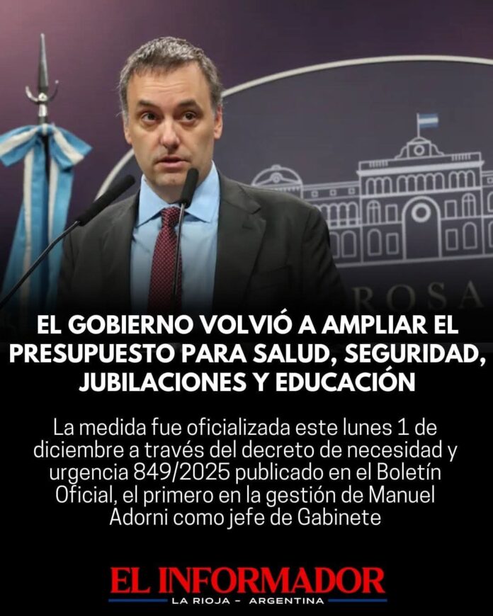 Inicio Destacadas El Gobierno volvió a ampliar el presupuesto para salud, seguridad, jubilaciones y...DestacadasEl Gobierno volvió a ampliar el presupuesto para salud, seguridad, jubilaciones y educación diciembre 1, 2025FacebookTwitterPinterestVKWhatsApp Artículos relacionadosMás del autorMujer fue asesinada en el Barrio Francisco Primero y el agresor llegó sin vida al HospitalJavier Milei: «Usted no puede pretender que haya sectores que no desaparezcan»La dura advertencia del FMI por la guerra en medio oriente ante el desplome de los mercadosDEJA UNA RESPUESTA Cancelar respuestaPor favor ingrese su comentario! Por favor ingrese su nombre aquí ¡Has introducido una dirección de correo electrónico incorrecta!Por favor ingrese su dirección de correo electrónico aquí Guardar mi nombre, correo electrónico y sitio web en este navegador la próxima vez que comente.
