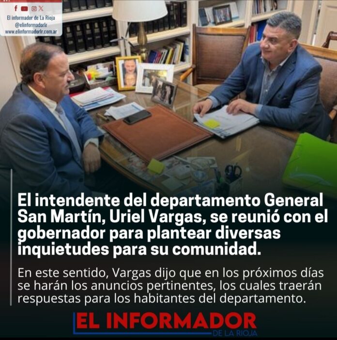 Inicio Local El Intendente del Departamento San Martín, Uriel Vargas, se reunió con el...LocalEl Intendente del Departamento San Martín, Uriel Vargas, se reunió con el gobernador para plantear diversas inquietudes para su comunidad noviembre 12, 2024FacebookTwitterPinterestVKWhatsApp Artículos relacionadosMás del autorLa Rioja homenajeó a los veteranos de Malvinas con el tradicional desfile del 2 de abrilEl COE inicia el operativo de Semana Santa en el Señor de la PeñaLa policía despliega un amplio operativo de seguridad por Semana SantaDEJA UNA RESPUESTA Cancelar respuestaPor favor ingrese su comentario! Por favor ingrese su nombre aquí ¡Has introducido una dirección de correo electrónico incorrecta!Por favor ingrese su dirección de correo electrónico aquí Guardar mi nombre, correo electrónico y sitio web en este navegador la próxima vez que comente.