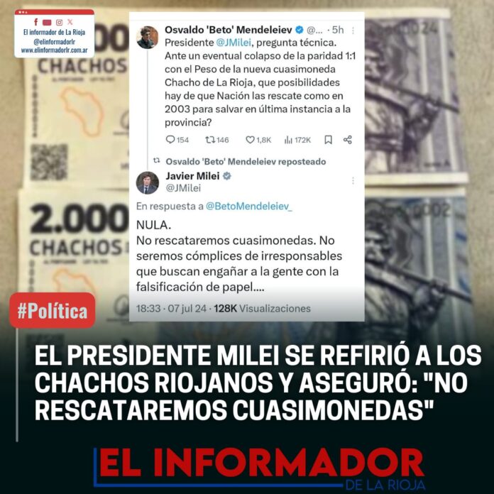 Inicio Destacadas EL PRESIDENTE MILEI SE REFIRIÓ A LOS CHACHOS RIOJANOS Y ASEGURÓ: «NO...DestacadasEL PRESIDENTE MILEI SE REFIRIÓ A LOS CHACHOS RIOJANOS Y ASEGURÓ: «NO RESCATAREMOS CUASIMONEDAS» julio 8, 2024FacebookTwitterPinterestVKWhatsApp Artículos relacionadosMás del autorLa carne subió un 10% en marzo y recarga el IPC, como en febreroSegún la escribana, Adorni compró el departamento de Caballito en 12 cuotas y sin interesesJavier Milei volvió a atacar a los periodistas y aseguró que «la motosierra sigue encendida»DEJA UNA RESPUESTA Cancelar respuestaPor favor ingrese su comentario! Por favor ingrese su nombre aquí ¡Has introducido una dirección de correo electrónico incorrecta!Por favor ingrese su dirección de correo electrónico aquí Guardar mi nombre, correo electrónico y sitio web en este navegador la próxima vez que comente.