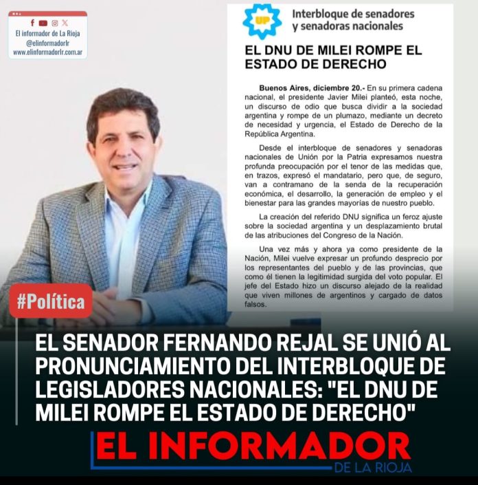 Inicio Destacadas EL SENADOR FERNANDO REJAL SE UNIÓ AL PRONUNCIAMIENTO DEL INTERBLOQUE DE LEGISLADORES...DestacadasEL SENADOR FERNANDO REJAL SE UNIÓ AL PRONUNCIAMIENTO DEL INTERBLOQUE DE LEGISLADORES NACIONALES: «EL DNU DE MILEI ROMPE EL ESTADO DE DERECHO» diciembre 21, 2023FacebookTwitterPinterestVKWhatsApp Artículos relacionadosMás del autorCanasta de crianza: Según el INDEC, en marzo criar un hijo superó los $500.000Otro viaje millonario de Adorni: Afirman que gastó miles de dólares en un lujoso hotel de BarilocheRecortes en el servicio Metereológico Nacional: Confirman más de 140 despidos en el sectorDEJA UNA RESPUESTA Cancelar respuestaPor favor ingrese su comentario! Por favor ingrese su nombre aquí ¡Has introducido una dirección de correo electrónico incorrecta!Por favor ingrese su dirección de correo electrónico aquí Guardar mi nombre, correo electrónico y sitio web en este navegador la próxima vez que comente.