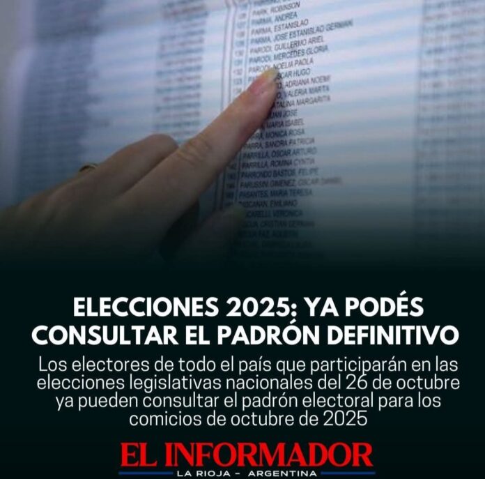 Inicio Política Elecciones 2025: ya podés consultar el padrón definitivoPolíticaElecciones 2025: ya podés consultar el padrón definitivo septiembre 17, 2025FacebookTwitterPinterestVKWhatsApp Artículos relacionadosMás del autorSegún la escribana, Adorni compró el departamento de Caballito en 12 cuotas y sin interesesJavier Milei volvió a atacar a los periodistas y aseguró que «la motosierra sigue encendida»Ley de Glaciares: La Libertad Avanza y aliados convirtieron en Ley la reforma de forma contundenteDEJA UNA RESPUESTA Cancelar respuestaPor favor ingrese su comentario! Por favor ingrese su nombre aquí ¡Has introducido una dirección de correo electrónico incorrecta!Por favor ingrese su dirección de correo electrónico aquí Guardar mi nombre, correo electrónico y sitio web en este navegador la próxima vez que comente.