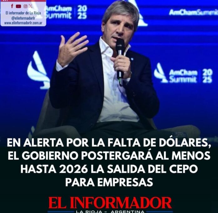 Inicio Destacadas En alerta por la falta de dólares, el gobierno postergará al menos...DestacadasEn alerta por la falta de dólares, el gobierno postergará al menos hasta 2026 la salida del cepo para empresas julio 24, 2025FacebookTwitterPinterestVKWhatsApp Artículos relacionadosMás del autorDetuvieron al hijastro del hombre de 88 años que fue encontrado sin vida en su casaYPF estabiliza el precio de la nafta por 45 días: No trasladará la suba del petróleoLa pobreza cayó en el segundo semestre y cerró el 2025 en 28,2%DEJA UNA RESPUESTA Cancelar respuestaPor favor ingrese su comentario! Por favor ingrese su nombre aquí ¡Has introducido una dirección de correo electrónico incorrecta!Por favor ingrese su dirección de correo electrónico aquí Guardar mi nombre, correo electrónico y sitio web en este navegador la próxima vez que comente.