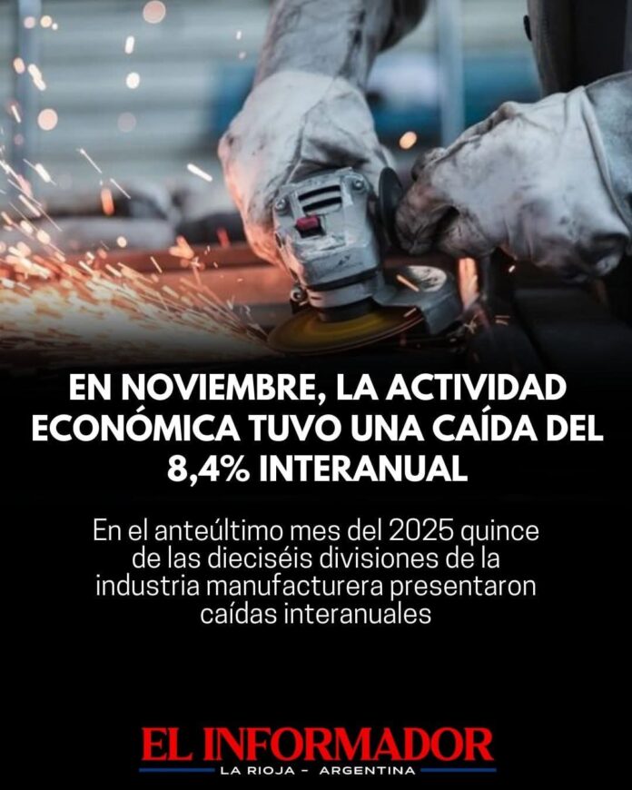 Inicio Destacadas En noviembre, la actividad económica tuvo una caída del 8,4% interanualDestacadasEn noviembre, la actividad económica tuvo una caída del 8,4% interanual enero 9, 2026FacebookTwitterPinterestVKWhatsApp Artículos relacionadosMás del autorLa Rioja firmó un convenio con la empresa China Hainan Trailblazer para avanzar en proyectos minerosSe perdieron casi 80 mil puestos de trabajo en la industria desde la asunción de MileiCayó con fuerza la confianza en el gobierno en abril: El nivel más bajo en toda la gestión de MileiDEJA UNA RESPUESTA Cancelar respuestaPor favor ingrese su comentario! Por favor ingrese su nombre aquí ¡Has introducido una dirección de correo electrónico incorrecta!Por favor ingrese su dirección de correo electrónico aquí Guardar mi nombre, correo electrónico y sitio web en este navegador la próxima vez que comente.