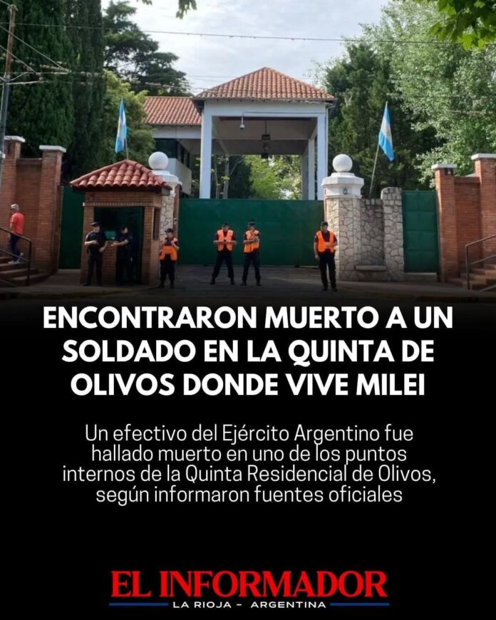 Inicio Destacadas Encontraron muerto a un soldado en la Quinta de Olivos donde vive...DestacadasEncontraron muerto a un soldado en la Quinta de Olivos donde vive Milei diciembre 17, 2025FacebookTwitterPinterestVKWhatsApp Artículos relacionadosMás del autorLa nafta registró otra suba y el litro ya supera los $1.800Cristina Kirchner declara en Comodoro PY por la causa cuadernosIrán advirtió que Milei «cruzó una linea roja» con sus declaraciones sobre el conflictoDEJA UNA RESPUESTA Cancelar respuestaPor favor ingrese su comentario! Por favor ingrese su nombre aquí ¡Has introducido una dirección de correo electrónico incorrecta!Por favor ingrese su dirección de correo electrónico aquí Guardar mi nombre, correo electrónico y sitio web en este navegador la próxima vez que comente.