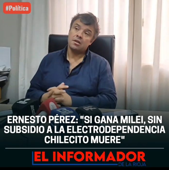 Inicio Política ERNESTO PÉREZ: «SI GANA MILEI, SIN SUBSIDIO A LA ELECTRODEPENDENCIA CHILECITO MUERE»PolíticaERNESTO PÉREZ: «SI GANA MILEI, SIN SUBSIDIO A LA ELECTRODEPENDENCIA CHILECITO MUERE» octubre 25, 2023FacebookTwitterPinterestVKWhatsApp Artículos relacionadosMás del autorLos gobernadores activan agendas paralelas para tratar de dinamizar la producción en sus provinciasEl Senador Pagotto y su hijo asesor con sueldo de 3, 5 millones en el SenadoGabriela Pedrali: «Desde que asumió Milei, más de 4.000 riojanos perdieron su trabajo»DEJA UNA RESPUESTA Cancelar respuestaPor favor ingrese su comentario! Por favor ingrese su nombre aquí ¡Has introducido una dirección de correo electrónico incorrecta!Por favor ingrese su dirección de correo electrónico aquí Guardar mi nombre, correo electrónico y sitio web en este navegador la próxima vez que comente.