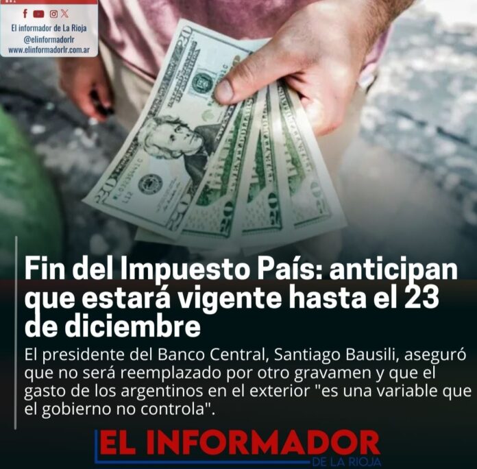 Inicio Destacadas Fin del impuesto país: anticipan que estará vigente hasta el 23 de...DestacadasFin del impuesto país: anticipan que estará vigente hasta el 23 de Diciembre noviembre 25, 2024FacebookTwitterPinterestVKWhatsApp Artículos relacionadosMás del autorYPF estabiliza el precio de la nafta por 45 días: No trasladará la suba del petróleoLa pobreza cayó en el segundo semestre y cerró el 2025 en 28,2%Franco Colapinto traerá la Formula 1 a las calles de Buenos Aires con un Road Show en PalermoDEJA UNA RESPUESTA Cancelar respuestaPor favor ingrese su comentario! Por favor ingrese su nombre aquí ¡Has introducido una dirección de correo electrónico incorrecta!Por favor ingrese su dirección de correo electrónico aquí Guardar mi nombre, correo electrónico y sitio web en este navegador la próxima vez que comente.