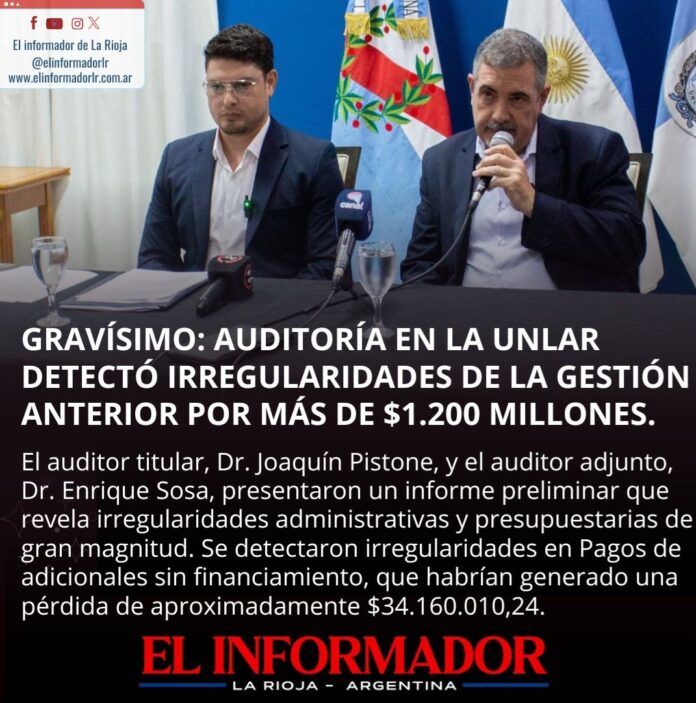 Inicio Local Gravísimo: auditoría en la UNLaR detectó irregularidades de la gestión anterior por...LocalGravísimo: auditoría en la UNLaR detectó irregularidades de la gestión anterior por más de $1200 millones febrero 18, 2025FacebookTwitterPinterestVKWhatsApp Artículos relacionadosMás del autorEl Gobierno reafirmó el «NUNCA MÁS» con un emotivo acto por los 50 años del golpeEmpleados Municipales acceden a controles de salud gratuitosEl Gobierno remarcó su compromiso vigente frente al terrorismo de EstadoDEJA UNA RESPUESTA Cancelar respuestaPor favor ingrese su comentario! Por favor ingrese su nombre aquí ¡Has introducido una dirección de correo electrónico incorrecta!Por favor ingrese su dirección de correo electrónico aquí Guardar mi nombre, correo electrónico y sitio web en este navegador la próxima vez que comente.