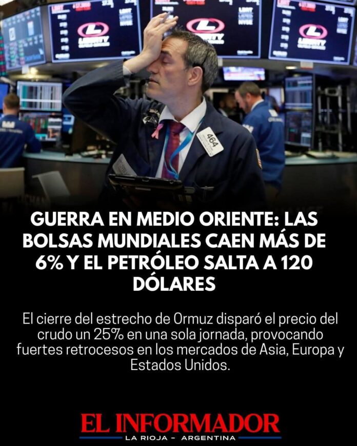Inicio Destacadas Guerra en medio oriente: Las bolsas mundiales caen más del 6% y...DestacadasGuerra en medio oriente: Las bolsas mundiales caen más del 6% y el petróleo salta a 120 dólares marzo 9, 2026FacebookTwitterPinterestVKWhatsApp Artículos relacionadosMás del autorJavier Milei: «Usted no puede pretender que haya sectores que no desaparezcan»La dura advertencia del FMI por la guerra en medio oriente ante el desplome de los mercadosMilei habló sobre su posible reelección: «Mi contrincante es la realidad»DEJA UNA RESPUESTA Cancelar respuestaPor favor ingrese su comentario! Por favor ingrese su nombre aquí ¡Has introducido una dirección de correo electrónico incorrecta!Por favor ingrese su dirección de correo electrónico aquí Guardar mi nombre, correo electrónico y sitio web en este navegador la próxima vez que comente.