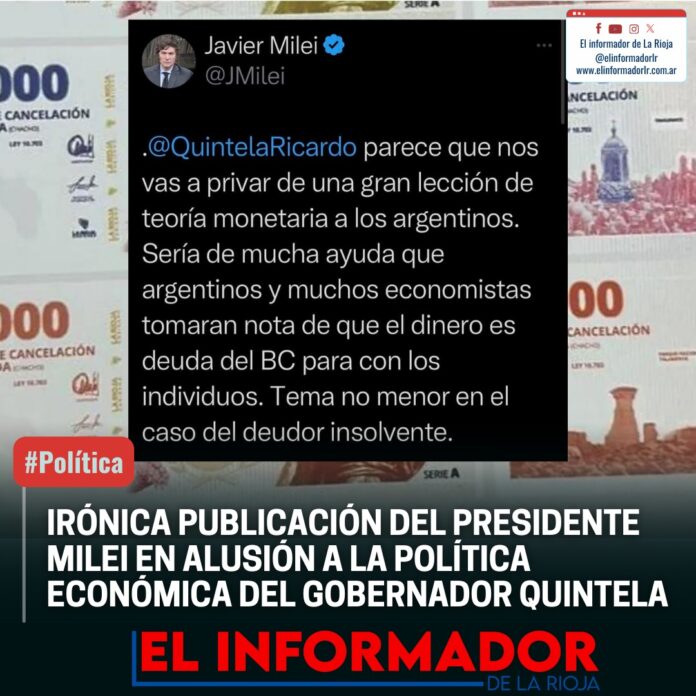 Inicio Política IRÓNICA PUBLICACIÓN DEL PRESIDENTE MILEI EN ALUSIÓN A LA POLÍTICA DE LA...PolíticaIRÓNICA PUBLICACIÓN DEL PRESIDENTE MILEI EN ALUSIÓN A LA POLÍTICA DE LA ECONOMÍA DEL GOBERNADOR QUINTELA marzo 2, 2024FacebookTwitterPinterestVKWhatsApp Artículos relacionadosMás del autorFernando Rejal: «No hay un cambio de esperanza para la Argentina……Pedrali continuará presidiendo la comisión de turismo y plantea consolidar una agenda de trabajo federalEncuesta: En redes el 91% tiene comentarios negativos contra Manuel AdorniDEJA UNA RESPUESTA Cancelar respuestaPor favor ingrese su comentario! Por favor ingrese su nombre aquí ¡Has introducido una dirección de correo electrónico incorrecta!Por favor ingrese su dirección de correo electrónico aquí Guardar mi nombre, correo electrónico y sitio web en este navegador la próxima vez que comente.