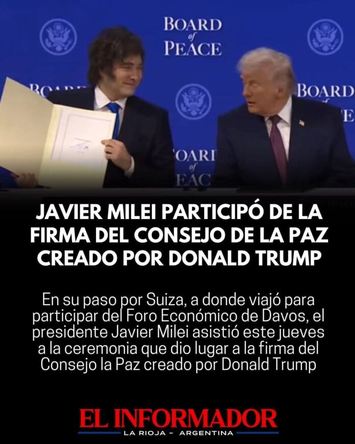 Inicio Destacadas Javier Milei participó de la firma del Concejo de la Paz creado...DestacadasJavier Milei participó de la firma del Concejo de la Paz creado por Donald Trump enero 23, 2026FacebookTwitterPinterestVKWhatsApp Artículos relacionadosMás del autorMujer fue asesinada en el Barrio Francisco Primero y el agresor llegó sin vida al HospitalJavier Milei: «Usted no puede pretender que haya sectores que no desaparezcan»La dura advertencia del FMI por la guerra en medio oriente ante el desplome de los mercadosDEJA UNA RESPUESTA Cancelar respuestaPor favor ingrese su comentario! Por favor ingrese su nombre aquí ¡Has introducido una dirección de correo electrónico incorrecta!Por favor ingrese su dirección de correo electrónico aquí Guardar mi nombre, correo electrónico y sitio web en este navegador la próxima vez que comente.