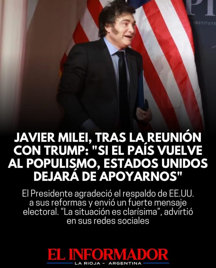 Inicio Destacadas Javier Milei, tras la reunión con Trump: «Si el país vuelve al...DestacadasJavier Milei, tras la reunión con Trump: «Si el país vuelve al populismo, Estados Unidos dejará de apoyarnos» octubre 16, 2025FacebookTwitterPinterestVKWhatsApp Artículos relacionadosMás del autorLa carne subió un 10% en marzo y recarga el IPC, como en febreroSegún la escribana, Adorni compró el departamento de Caballito en 12 cuotas y sin interesesJavier Milei volvió a atacar a los periodistas y aseguró que «la motosierra sigue encendida»DEJA UNA RESPUESTA Cancelar respuestaPor favor ingrese su comentario! Por favor ingrese su nombre aquí ¡Has introducido una dirección de correo electrónico incorrecta!Por favor ingrese su dirección de correo electrónico aquí Guardar mi nombre, correo electrónico y sitio web en este navegador la próxima vez que comente.