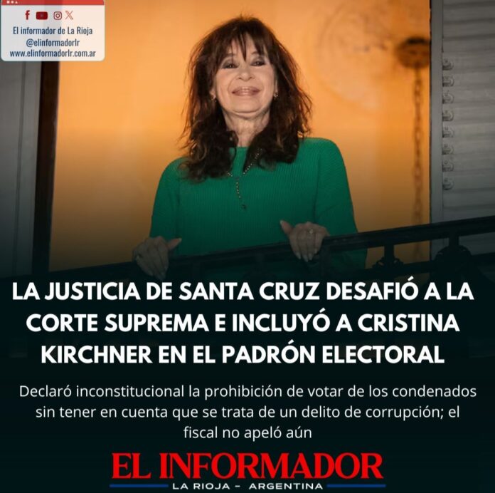 Inicio Destacadas La Justicia de Santa Cruz desafió a la Corte Suprema e incluyó...DestacadasLa Justicia de Santa Cruz desafió a la Corte Suprema e incluyó a Cristina Kirchner en el padrón electoral julio 26, 2025FacebookTwitterPinterestVKWhatsApp Artículos relacionadosMás del autorDetuvieron al hijastro del hombre de 88 años que fue encontrado sin vida en su casaYPF estabiliza el precio de la nafta por 45 días: No trasladará la suba del petróleoLa pobreza cayó en el segundo semestre y cerró el 2025 en 28,2%DEJA UNA RESPUESTA Cancelar respuestaPor favor ingrese su comentario! Por favor ingrese su nombre aquí ¡Has introducido una dirección de correo electrónico incorrecta!Por favor ingrese su dirección de correo electrónico aquí Guardar mi nombre, correo electrónico y sitio web en este navegador la próxima vez que comente.
