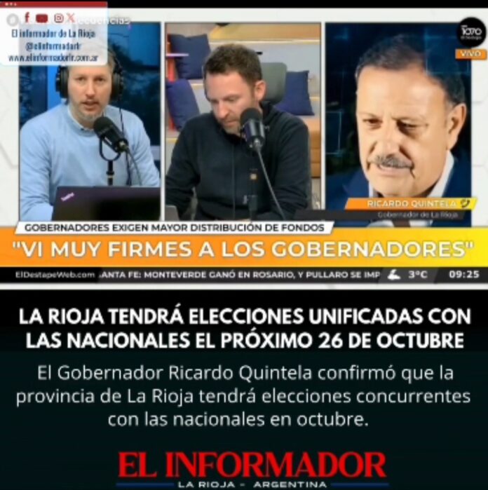 Inicio Destacadas La Rioja tendrá elecciones unificadas con las nacionales el próximo 26 de...DestacadasLa Rioja tendrá elecciones unificadas con las nacionales el próximo 26 de octubre junio 30, 2025FacebookTwitterPinterestVKWhatsApp Artículos relacionadosMás del autorDetuvieron al hijastro del hombre de 88 años que fue encontrado sin vida en su casaYPF estabiliza el precio de la nafta por 45 días: No trasladará la suba del petróleoLa pobreza cayó en el segundo semestre y cerró el 2025 en 28,2%DEJA UNA RESPUESTA Cancelar respuestaPor favor ingrese su comentario! Por favor ingrese su nombre aquí ¡Has introducido una dirección de correo electrónico incorrecta!Por favor ingrese su dirección de correo electrónico aquí Guardar mi nombre, correo electrónico y sitio web en este navegador la próxima vez que comente.