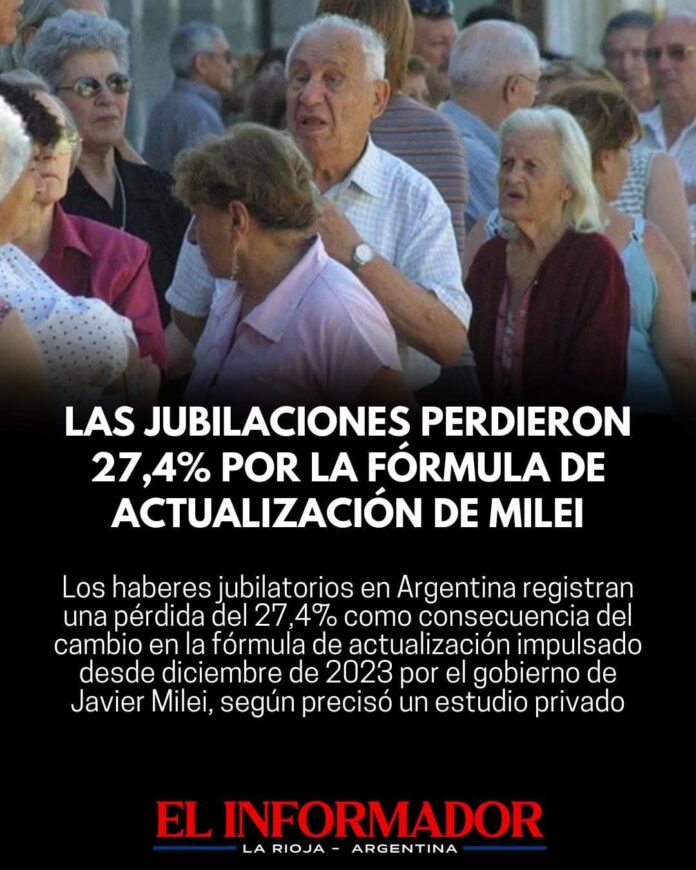 Inicio Destacadas Las jubilaciones perdieron 27,4% por la fórmula de actualización de MileiDestacadasLas jubilaciones perdieron 27,4% por la fórmula de actualización de Milei enero 7, 2026FacebookTwitterPinterestVKWhatsApp Artículos relacionadosMás del autorLa nueva guerra en Nuevo Oriente mantiene al comercio internacional bajo un manto de incertidumbreCaputo: «El problema no es un despido, sino que nadie quiere contratar a nadie»Nahuel Gallo llegó a la Argentina y fue recibido por su esposa e hijoDEJA UNA RESPUESTA Cancelar respuestaPor favor ingrese su comentario! Por favor ingrese su nombre aquí ¡Has introducido una dirección de correo electrónico incorrecta!Por favor ingrese su dirección de correo electrónico aquí Guardar mi nombre, correo electrónico y sitio web en este navegador la próxima vez que comente.