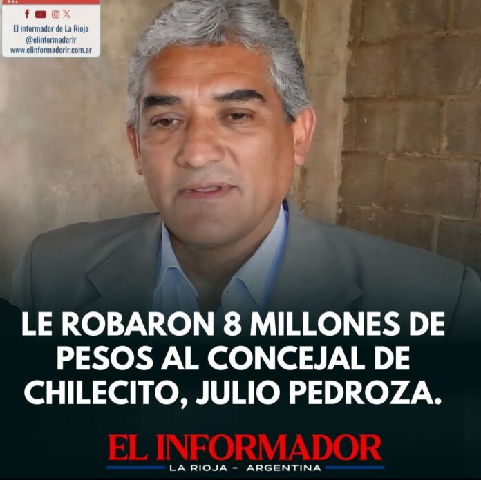 Inicio Local Le robaron 8 millones de pesos al concejal de Chilecito, Julio PedrozaLocalLe robaron 8 millones de pesos al concejal de Chilecito, Julio Pedroza agosto 2, 2025FacebookTwitterPinterestVKWhatsApp Artículos relacionadosMás del autorEncontraron a un hombre de 86 años que llevaba meses muerto en su domicilio en Barrio FerroviarioLa Rioja homenajeó a los veteranos de Malvinas con el tradicional desfile del 2 de abrilEl COE inicia el operativo de Semana Santa en el Señor de la PeñaDEJA UNA RESPUESTA Cancelar respuestaPor favor ingrese su comentario! Por favor ingrese su nombre aquí ¡Has introducido una dirección de correo electrónico incorrecta!Por favor ingrese su dirección de correo electrónico aquí Guardar mi nombre, correo electrónico y sitio web en este navegador la próxima vez que comente.