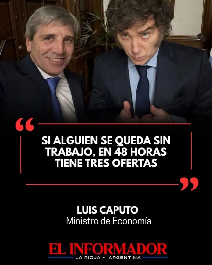 Inicio Destacadas Luis Caputo: «Si alguien se queda sin trabajo en 48 horas tiene...DestacadasLuis Caputo: «Si alguien se queda sin trabajo en 48 horas tiene tres ofertas» marzo 12, 2026FacebookTwitterPinterestVKWhatsApp Artículos relacionadosMás del autorSenadores pasarán a cobrar $11 millones por mes tras un nuevo acuerdo salarialCausa Cuadernos: Cristina Kirchner deberá declarar de manera presencialLa Perla: Identificaron en Córdoba los restos de 12 víctimas de la última dictadura militarDEJA UNA RESPUESTA Cancelar respuestaPor favor ingrese su comentario! Por favor ingrese su nombre aquí ¡Has introducido una dirección de correo electrónico incorrecta!Por favor ingrese su dirección de correo electrónico aquí Guardar mi nombre, correo electrónico y sitio web en este navegador la próxima vez que comente.