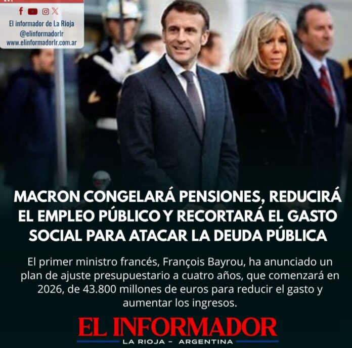 Inicio Política Macrón congelará pensiones, reducirá el empleo público y recortará el gasto social...PolíticaMacrón congelará pensiones, reducirá el empleo público y recortará el gasto social para atacar la deuda pública julio 17, 2025FacebookTwitterPinterestVKWhatsApp Artículos relacionadosMás del autorEl funcionario echado por Sandra Pettovello tras tomar un crédito hipotecario defendió su gestión: «Lamento el desenlace»Ricardo Quintela: «Argentina se construye con unidad y con un proyecto que defienda la nuestro»Intendentes denuncian «asfixia financiera» y reclaman mayor distribución de recursosDEJA UNA RESPUESTA Cancelar respuestaPor favor ingrese su comentario! Por favor ingrese su nombre aquí ¡Has introducido una dirección de correo electrónico incorrecta!Por favor ingrese su dirección de correo electrónico aquí Guardar mi nombre, correo electrónico y sitio web en este navegador la próxima vez que comente.