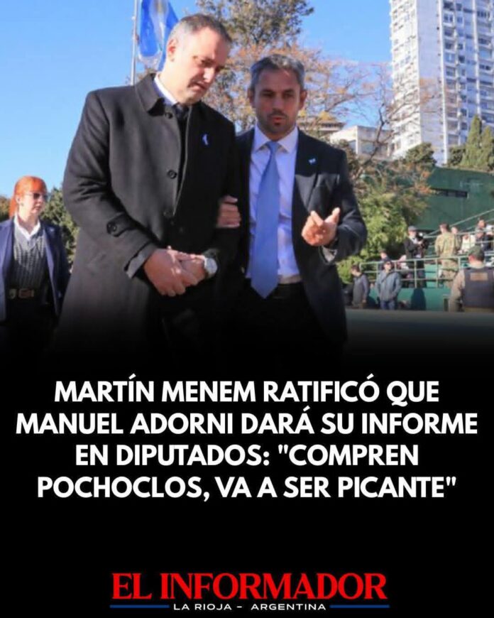 Inicio Destacadas Martín Menem ratificó que Manuel Adorni dará su informe en Diputados: «Compren...DestacadasPolíticaMartín Menem ratificó que Manuel Adorni dará su informe en Diputados: «Compren pochoclos, va a ser picante» abril 14, 2026FacebookTwitterPinterestVKWhatsApp Artículos relacionadosMás del autorLa nafta subió más de un 23% desde el inicio de la guerra y llenar el tanque cuesta más de $100 milSegún el INDEC: Casi la mitad de los argentinos trabaja en la informalidad$2.342.861 es lo que una familia de dos adultos y dos menores necesitó en marzo para ser considerada de clase mediaDEJA UNA RESPUESTA Cancelar respuestaPor favor ingrese su comentario! Por favor ingrese su nombre aquí ¡Has introducido una dirección de correo electrónico incorrecta!Por favor ingrese su dirección de correo electrónico aquí Guardar mi nombre, correo electrónico y sitio web en este navegador la próxima vez que comente.