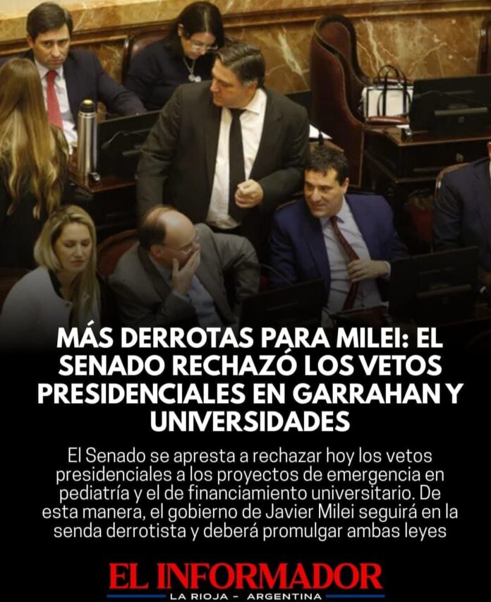 Inicio Destacadas Mas derrotas para Milei: El Senado rechazó los vetos presidenciales en Garrahan...DestacadasMas derrotas para Milei: El Senado rechazó los vetos presidenciales en Garrahan y Universidades octubre 3, 2025FacebookTwitterPinterestVKWhatsApp Artículos relacionadosMás del autorLa carne subió un 10% en marzo y recarga el IPC, como en febreroSegún la escribana, Adorni compró el departamento de Caballito en 12 cuotas y sin interesesJavier Milei volvió a atacar a los periodistas y aseguró que «la motosierra sigue encendida»DEJA UNA RESPUESTA Cancelar respuestaPor favor ingrese su comentario! Por favor ingrese su nombre aquí ¡Has introducido una dirección de correo electrónico incorrecta!Por favor ingrese su dirección de correo electrónico aquí Guardar mi nombre, correo electrónico y sitio web en este navegador la próxima vez que comente.