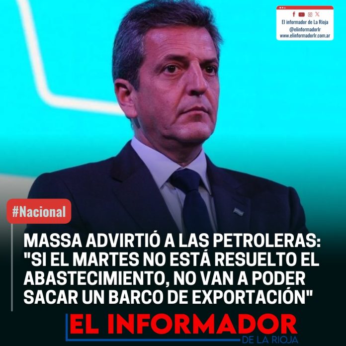Inicio Destacadas MASSA ADVIRTIÓ A LAS PETROLERAS: «SI EL MARTES NO ESTÁ RESUELTO EL...DestacadasMASSA ADVIRTIÓ A LAS PETROLERAS: «SI EL MARTES NO ESTÁ RESUELTO EL ABASTECIMIENTO, NO VAN A PODER SACAR UN BARCO DE EXPORTACIÓN» octubre 30, 2023FacebookTwitterPinterestVKWhatsApp Artículos relacionadosMás del autorDos millones de personas desocupadas o trabajando en negro en ArgentinaDiputados pidieron interpelar a Karina Milei y a Adorni y exigen respuestas de Javier MileiWado de Pedro: «El Gobernador Quintela pelea todos los días para defender a su pueblo y los recursos que le corresponden»DEJA UNA RESPUESTA Cancelar respuestaPor favor ingrese su comentario! Por favor ingrese su nombre aquí ¡Has introducido una dirección de correo electrónico incorrecta!Por favor ingrese su dirección de correo electrónico aquí Guardar mi nombre, correo electrónico y sitio web en este navegador la próxima vez que comente.