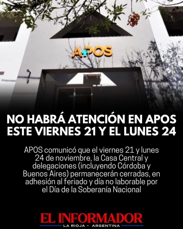 Inicio Local No habrá atención en APOS este viernes 21 y lunes 24LocalNo habrá atención en APOS este viernes 21 y lunes 24 noviembre 20, 2025FacebookTwitterPinterestVKWhatsApp Artículos relacionadosMás del autorLa provincia refuerza los protocolos escolares con nuevas medidas ante amenazas de violenciaLa Rioja promovió su potencial turístico y planteó la necesidad de apoyo nacional para sostener la actividadEl Rally riojano pone segunda en Tama el próximo 16 y 17 de MayoDEJA UNA RESPUESTA Cancelar respuestaPor favor ingrese su comentario! Por favor ingrese su nombre aquí ¡Has introducido una dirección de correo electrónico incorrecta!Por favor ingrese su dirección de correo electrónico aquí Guardar mi nombre, correo electrónico y sitio web en este navegador la próxima vez que comente.