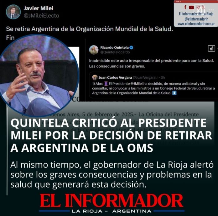Inicio Destacadas Quintela criticó al Presidente Milei por la decisión de retirar a la...DestacadasQuintela criticó al Presidente Milei por la decisión de retirar a la Argentina de la OMS febrero 6, 2025FacebookTwitterPinterestVKWhatsApp Artículos relacionadosMás del autorDetuvieron al hijastro del hombre de 88 años que fue encontrado sin vida en su casaYPF estabiliza el precio de la nafta por 45 días: No trasladará la suba del petróleoLa pobreza cayó en el segundo semestre y cerró el 2025 en 28,2%DEJA UNA RESPUESTA Cancelar respuestaPor favor ingrese su comentario! Por favor ingrese su nombre aquí ¡Has introducido una dirección de correo electrónico incorrecta!Por favor ingrese su dirección de correo electrónico aquí Guardar mi nombre, correo electrónico y sitio web en este navegador la próxima vez que comente.