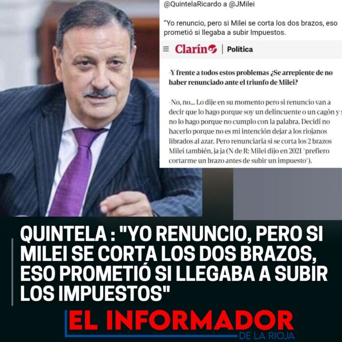 Inicio Destacadas QUINTELA: «YO RENUNCIO, PERO SI MILEI SE CORTA LOS 2 BRAZOS, ESO...DestacadasQUINTELA: «YO RENUNCIO, PERO SI MILEI SE CORTA LOS 2 BRAZOS, ESO PROMETIÓ SI LLEGADA A SUBIR LOS IMPUESTOS» febrero 5, 2024FacebookTwitterPinterestVKWhatsApp Artículos relacionadosMás del autorAfirman que Adorni compró el departamento de Caballito en U$S230 mil dólares con un préstamo de dos jubiladasHallan el cuerpo sin vida del jóven que cayó al dique de OltaHorror en Santa Fe: Un alumno fue armado al Colegio y mató a un compañeroDEJA UNA RESPUESTA Cancelar respuestaPor favor ingrese su comentario! Por favor ingrese su nombre aquí ¡Has introducido una dirección de correo electrónico incorrecta!Por favor ingrese su dirección de correo electrónico aquí Guardar mi nombre, correo electrónico y sitio web en este navegador la próxima vez que comente.