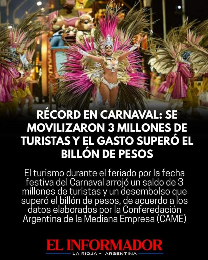 Inicio Destacadas Récord en carnaval: Se movilizaron 3 millones de turistas y el gasto...DestacadasTurismoRécord en carnaval: Se movilizaron 3 millones de turistas y el gasto superó el billón de pesos febrero 18, 2026FacebookTwitterPinterestVKWhatsApp Artículos relacionadosMás del autorDetuvieron al hijastro del hombre de 88 años que fue encontrado sin vida en su casaYPF estabiliza el precio de la nafta por 45 días: No trasladará la suba del petróleoLa pobreza cayó en el segundo semestre y cerró el 2025 en 28,2%DEJA UNA RESPUESTA Cancelar respuestaPor favor ingrese su comentario! Por favor ingrese su nombre aquí ¡Has introducido una dirección de correo electrónico incorrecta!Por favor ingrese su dirección de correo electrónico aquí Guardar mi nombre, correo electrónico y sitio web en este navegador la próxima vez que comente.
