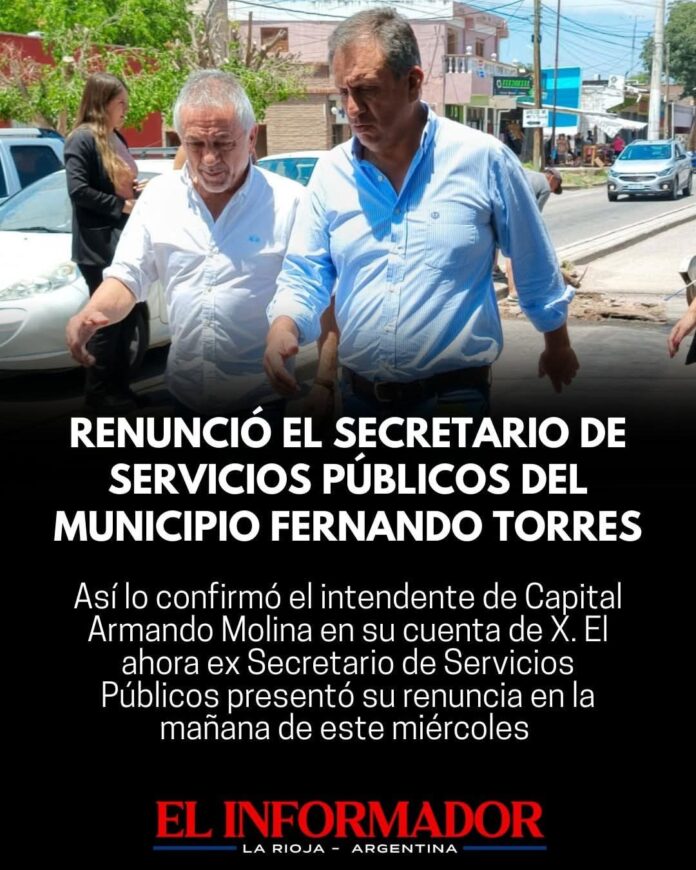 Inicio Local Renunció el Secretario de Servicios Públicos del Municipio Fernando TorresLocalRenunció el Secretario de Servicios Públicos del Municipio Fernando Torres diciembre 11, 2025FacebookTwitterPinterestVKWhatsApp Artículos relacionadosMás del autorVuelven los corsos riojanos con comparsas y murgas de toda la provinciaIncendio en el supermercado Mayor fue controlado por bomberosLa CGT dialogó con Quintela y planteó la necesidad de fortalecer la unidad de los sectores popularesDEJA UNA RESPUESTA Cancelar respuestaPor favor ingrese su comentario! Por favor ingrese su nombre aquí ¡Has introducido una dirección de correo electrónico incorrecta!Por favor ingrese su dirección de correo electrónico aquí Guardar mi nombre, correo electrónico y sitio web en este navegador la próxima vez que comente.