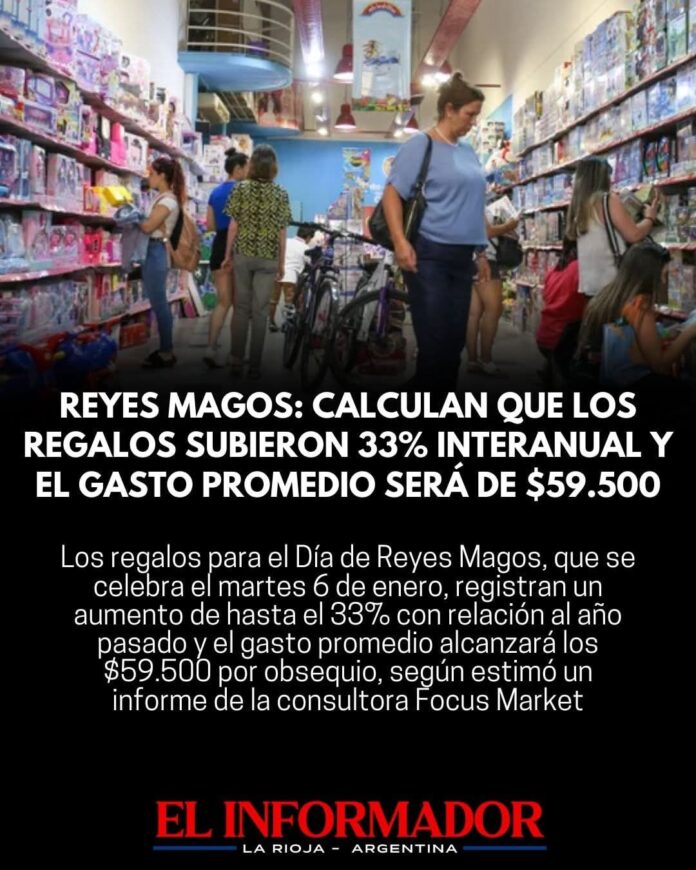 Inicio Destacadas Reyes Magos: Calculan que los regalos subieron 33% interanual y el gasto...DestacadasReyes Magos: Calculan que los regalos subieron 33% interanual y el gasto promedio será de $59.500 enero 6, 2026FacebookTwitterPinterestVKWhatsApp Artículos relacionadosMás del autorLa nueva guerra en Nuevo Oriente mantiene al comercio internacional bajo un manto de incertidumbreCaputo: «El problema no es un despido, sino que nadie quiere contratar a nadie»Nahuel Gallo llegó a la Argentina y fue recibido por su esposa e hijoDEJA UNA RESPUESTA Cancelar respuestaPor favor ingrese su comentario! Por favor ingrese su nombre aquí ¡Has introducido una dirección de correo electrónico incorrecta!Por favor ingrese su dirección de correo electrónico aquí Guardar mi nombre, correo electrónico y sitio web en este navegador la próxima vez que comente.
