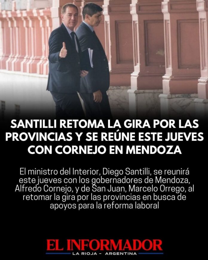 DestacadasActualizado: enero 15, 2026Santilli retoma la gira por las provincias y se reúne este jueves con Cornejo en Mendozaenero 15, 2026CuotaFacebookTwitterPinterestVKWhatsApp Mas NoticiasLocalSaul Narvaez - febrero 4, 2026Cronograma de pago: Haberes eneroLocalSaul Narvaez - febrero 3, 2026Cronograma de pago: Haberes eneroLocalSaul Narvaez - febrero 3, 2026Cronograma de pago: Haberes eneroCuotaFacebookTwitterPinterestVKWhatsApp Artículo anteriorKicillof sobre la situación de la industria y el turismo: «Tenemos una crisis tan grande como la de la pandemia»Artículo siguienteRige una alerta por tormentas en La Rioja y anticipan lluvias hasta el domingo- Advertisement - DEJA UNA RESPUESTA Cancelar respuestaComentario:Por favor ingrese su comentario! Nombre:*Por favor ingrese su nombre aquí Correo electrónico:*¡Has introducido una dirección de correo electrónico incorrecta!Por favor ingrese su dirección de correo electrónico aquí Sitio web: Guardar mi nombre, correo electrónico y sitio web en este navegador la próxima vez que comente. Ultimas noticiasLocalSaul Narvaez - febrero 4, 2026Cronograma de pago: Haberes enero LocalCronograma de pago: Haberes enero Saul Narvaez - febrero 3, 2026 LocalCronograma de pago: Haberes enero Saul Narvaez - febrero 3, 2026 LocalIniciarán obras con fondos provinciales en el Departamento Ángel Vicente Peñaloza Saul Narvaez - enero 31, 2026 LocalRicardo Quintela: «La formación de jóvenes líderes es fundamental para el desarrollo de nuestra provincia» Saul Narvaez - enero 31, 2026 Esto tambien te puede interesarDeclaran la emergencia ignea en cuatro provincias por incendios en la Patagonia Destacadas Saul Narvaez - enero 30, 2026 Golpe a la jubilación mínima: El bono sigue congelado en $70.000 Destacadas Saul Narvaez - enero 30, 2026 Bullrich admitió que la emergencia por incendios podria sumarse al temario de extraordinarias Destacadas Saul Narvaez - enero 30, 2026 Milei volvió a criticar al kirchnerismo y sostuvo que «por suerte están de salida» Destacadas Saul Narvaez - enero 30, 2026 - Advertisement -
