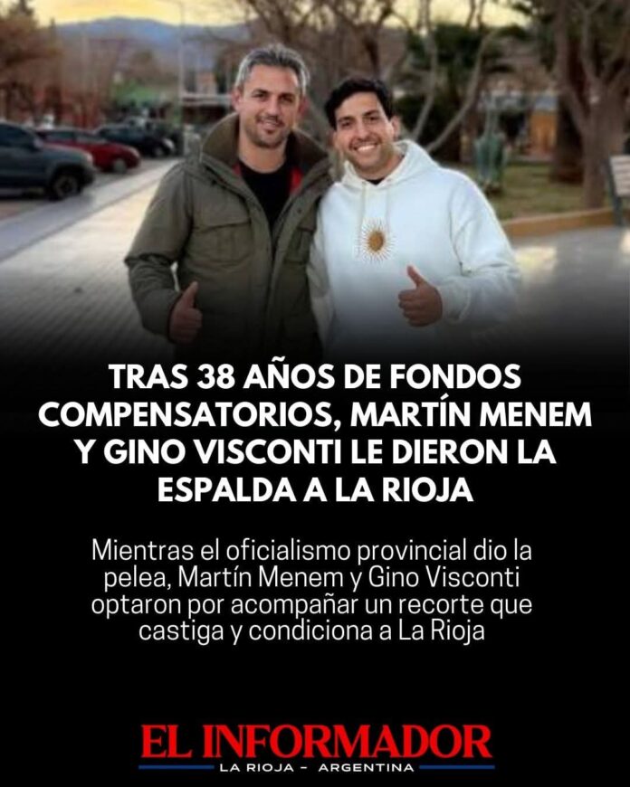 Inicio Destacadas Tras 38 años de fondos compensatorios Martín Menem y Gino Visconti le...DestacadasTras 38 años de fondos compensatorios Martín Menem y Gino Visconti le dieron la espalda a La Rioja diciembre 27, 2025FacebookTwitterPinterestVKWhatsApp Artículos relacionadosMás del autorFranco Colapinto traerá la Formula 1 a las calles de Buenos Aires con un Road Show en PalermoAfirman que Adorni compró el departamento de Caballito en U$S230 mil dólares con un préstamo de dos jubiladasHallan el cuerpo sin vida del jóven que cayó al dique de OltaDEJA UNA RESPUESTA Cancelar respuestaPor favor ingrese su comentario! Por favor ingrese su nombre aquí ¡Has introducido una dirección de correo electrónico incorrecta!Por favor ingrese su dirección de correo electrónico aquí Guardar mi nombre, correo electrónico y sitio web en este navegador la próxima vez que comente.